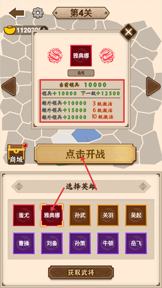 1、在【第4关】选择【雅典娜】出战,当前领兵10000,升级后可解锁额外领兵加成,选好后点击【点击开战】进入对局。