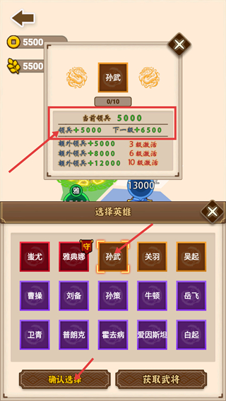 4、切换选择【孙武】作为驻守英雄,其当前领兵5000,升级后可解锁额外领兵,选好后点击【确认选择】生效加成。