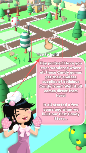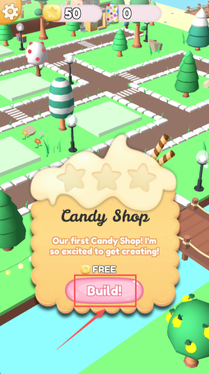 2、建造商店:在建造界面中,点击FREE按钮,花费50糖果建造第一间Candy Shop。