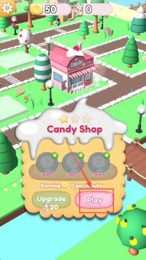 3、升级店铺:进入店铺管理界面,查看50糖果与每分钟收益,点击Upgrade提升等级。