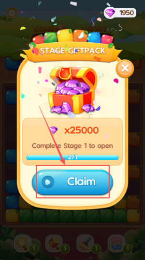 4、领取礼盒:当分数累计至1950,界面弹出STAGE GIFTPACK,点击“Claim”领取25000奖励并解锁下一关。