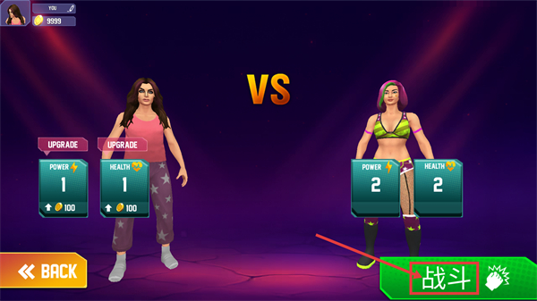 1、对战前可通过【UPGRADE】提升【POWER-1】【HEALTH-1】,消耗100货币强化属性,再点击【战斗】开启对决。