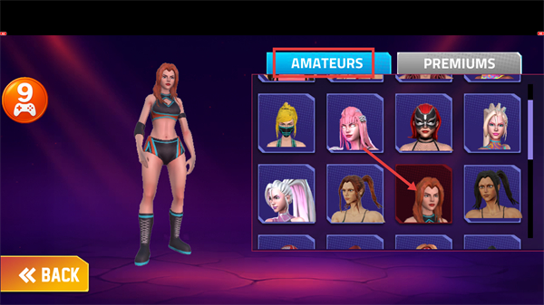 1、在角色选择界面,先从【AMATEURS】分类中选定对应角色,完成后可点击【BACK】返回主界面。