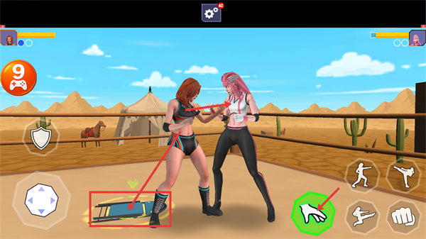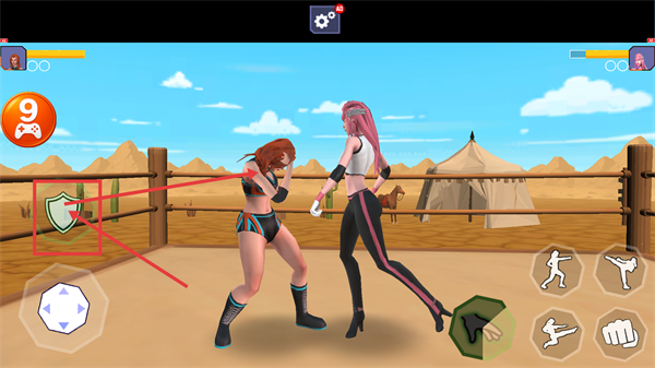 2、进入对战后,注意界面左侧的【盾牌】防御按钮,右侧是攻击动作键,需灵活切换攻防操作。