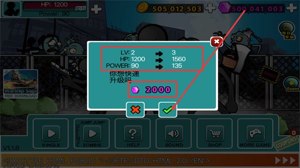 1、界面弹出升级提示时,消耗【2000】钻石可将【LV:2】提升至3级,同时【HP:1200】和【POWER:90】同步增长。