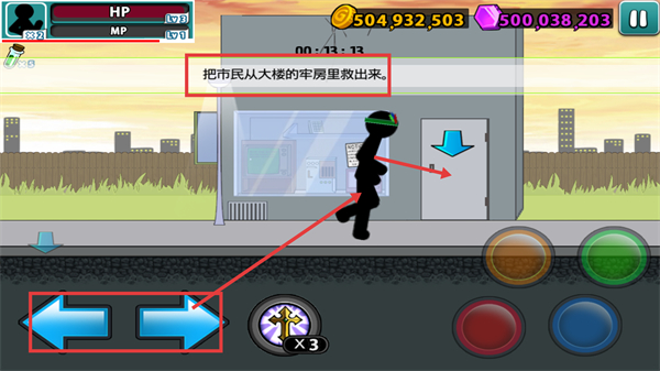 2、接取【把市民从大楼的牢房里救出来】任务后,通过左右方向键操控角色移动,靠近带箭头标识的房门进入。