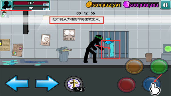3、进入牢房区域后,使用红色攻击键击败敌人,靠近蓝色市民剪影即可完成救援相关的交互步骤。