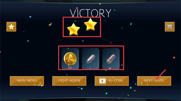 4、通关后获得【2】星评价与【452】金币等奖励,点击【NEXT-LEVEL】按钮进入下一关积累更多资源。