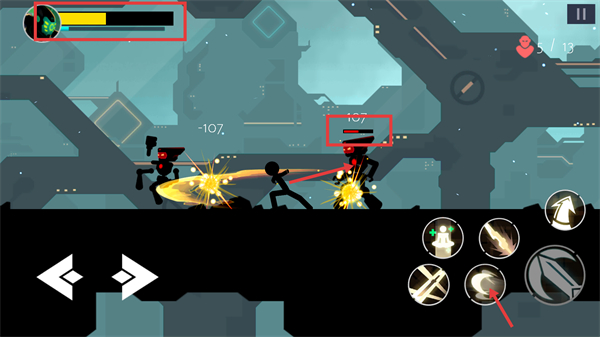 2、战斗中观察敌方【-107】伤害数值,及时释放技能反击,同时留意右上角【5/13】收集进度推进目标。
