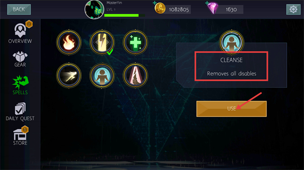 1、在【SPELLS】界面选择【CLEANSE】技能,点击【USE】按钮使用,可移除所有控制效果提升战斗容错。