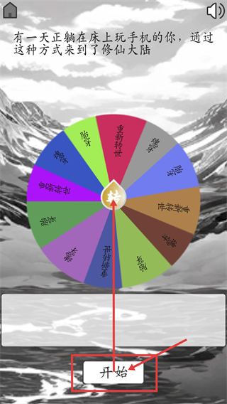 2、进入模式后点击【开始】转动转盘,随机获得穿越方式,这是进入修仙大陆的初始流程。