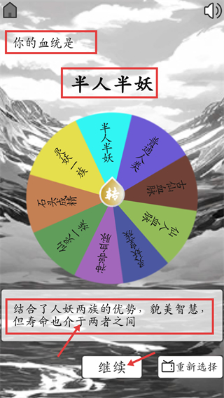4、抽到【半人半妖】血统后,利用其人妖两族的优势发展,点击【继续】推进后续角色养成流程。
