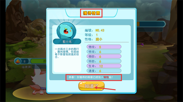 4、成功捕获后会显示【获得精灵】界面,可查看【蓝小毛】的属性,点击【知道了】完成流程并将其存入背包。