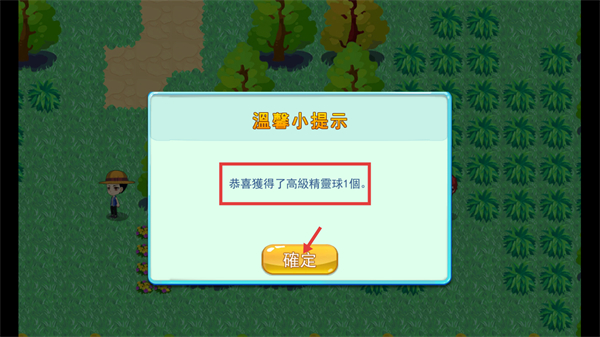 2、拾取道具后会弹出【温馨小提示】,显示获得【高级精灵球1个】,点击【确定】即可将道具收入背包。