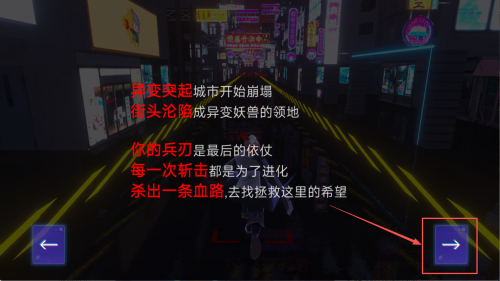 2、了解背景:阅读游戏背景故事,了解游戏设定和目标,点击箭头继续。
