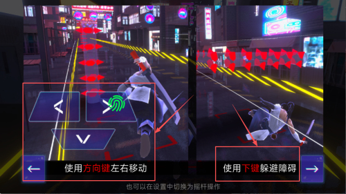 3、掌握操作:学习基本操作,使用方向键左右移动,使用下键躲避障碍。