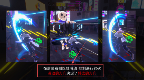2、开启赛博街头跑酷,保持高速奔跑的同时,观察前方变异怪物位置,滑动对应方向屏幕发起攻击,实现一击必杀避免被围堵。