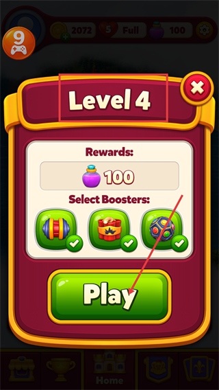 1、【Level-4】可领取【100-紫色药水】奖励,勾选boosters后点击【Play】即可开始关卡。