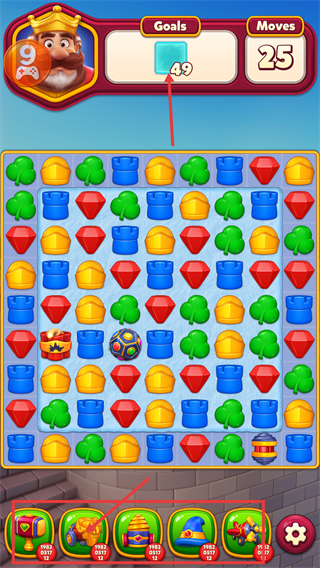 2、目标是收集【49-蓝色方块】,剩余【25-步数】,利用已选道具可加速消除目标元素。