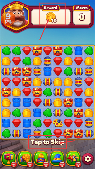 3、关卡结束后可获得【10-金币】奖励,点击【Tap-to-Skip】可跳过结算动画返回主界面。