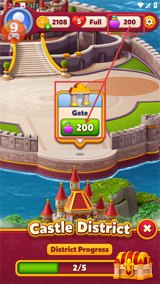 4、在【Castle-District】界面,消耗【200-紫色药水】可解锁【Gate】建筑,推进区域进度。