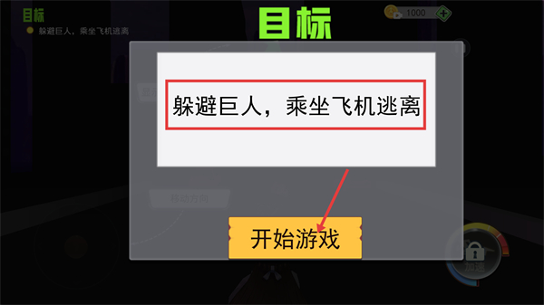 1、明确核心任务为【躲避巨人-乘坐飞机逃离】,点击【开始游戏】按钮即可进入逃生关卡。