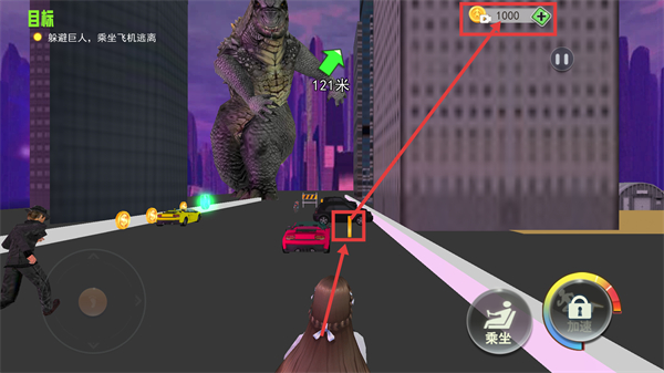3、靠近车辆时点击【乘坐】按钮切换载具,同时收集金币可提升【1000】等资源数值。