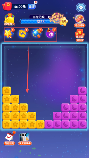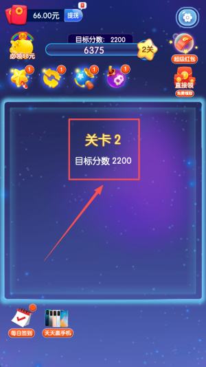 4、挑战关卡:进入关卡2,目标分数2200,达成6375分后点击“提现”即可赢取天天手机奖励。
