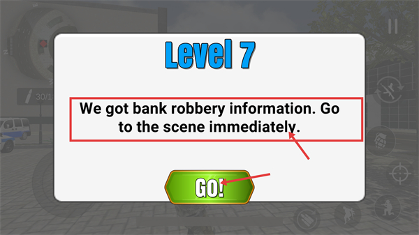 1、【Level-7】的任务是【We-got-bank-robbery-information.-Go-to-the-scene-immediately.】,点击【GO!】按钮前往现场。