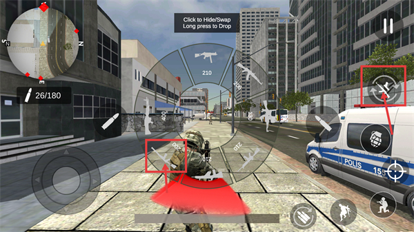 3、点击武器切换按钮可更换装备,当前弹药为【26/180】,长按可丢弃不需要的武器。