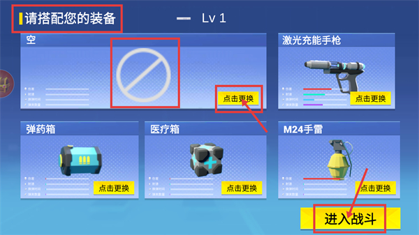1、在装备界面点击【配备更换】,将【Nothing】替换为【激光充能手枪】等武器,搭配【弹药箱】等道具后再点击【进入战斗】。
