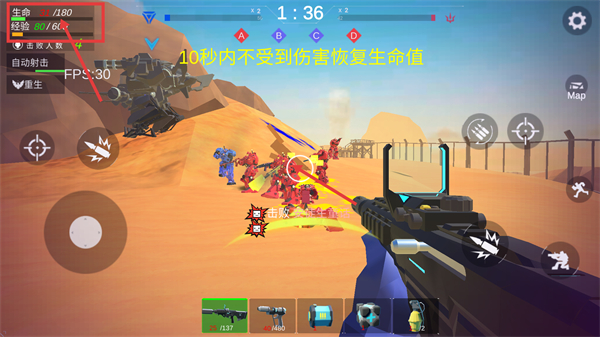 3、当出现【10秒内不受到伤害恢复生命值】提示时,需暂时躲避敌方攻击,利用掩体回复生命。