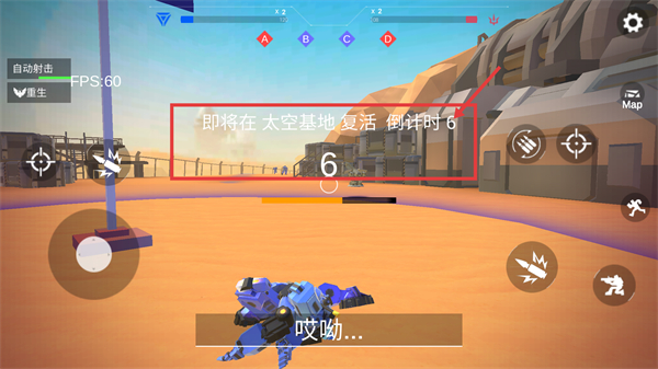 4、若显示【即将在太空基地复活-倒计时6】,等待倒计时结束后即可在指定区域复活,继续参与对战。