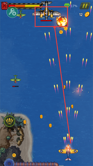 2、战斗中操控战机躲避敌方弹幕,优先攻击敌方单位积累进度,界面顶部会显示当前击败敌人的百分比。