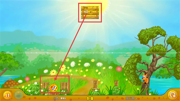 2、【1-8】关卡里,通过机关操作让角色抵达宝箱下方,解锁宝箱获取奖励,提升关卡收益。