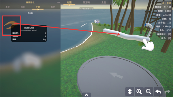 4、在【手脚】分类中选择【Crusty-Crab】部件,其可增加复杂度-3、生命-8等属性,丰富身体构造。