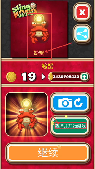 4、获得【螃蟹】角色后,点击【选择并开始游戏】,即可使用该角色开启新一轮弹射关卡。