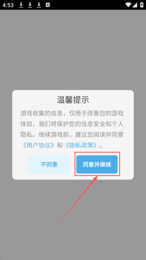 1、同意条款:进入游戏后,阅读并点击“同意并继续”以接受用户协议和隐私政策。