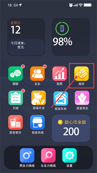 1、在主界面找到【搬砖】功能入口,该模块是获取【甜心币】的基础途径,初始【甜心币余额-200】可用于后续操作。