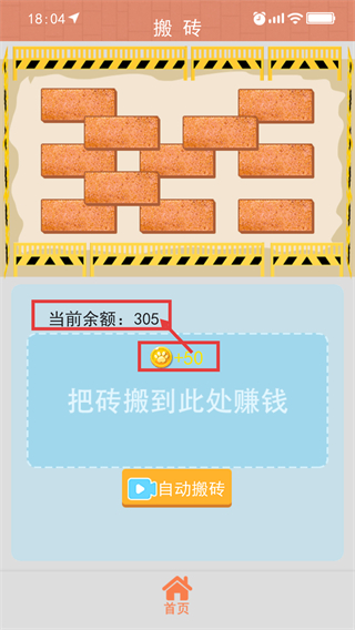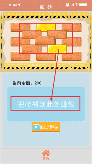 2、进入【搬砖】界面后,需将砖块移至【把砖搬到此地赚钱】指定区域来获取收益,也可选择【自动搬砖】简化操作。