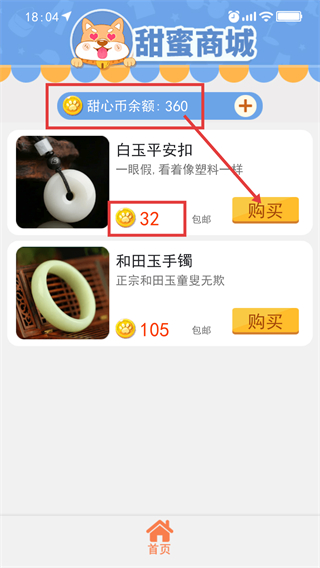 4、在【甜蜜商城】中,可用【甜心币】购买物品,如【白玉平安扣】需消耗【32】甜心币,购买前需确认余额充足。