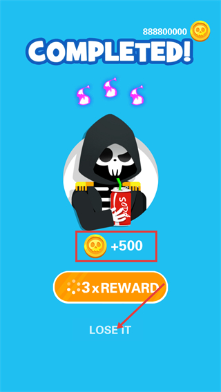 4、通关后出现【COMPLETED!】界面,选择对应选项可获取【+500】货币,积累后可解锁死神装扮。