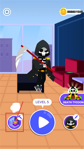 1、进入【LEVEL-5】前,先点击左下角道具图标解锁场景装饰,再启动蓝色按钮进入【DEATH-TYCOON】关卡。