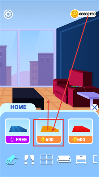2、在【HOME】界面中,消耗【500】货币解锁黄色地板装饰,可提升场景装饰度以推进关卡进度。