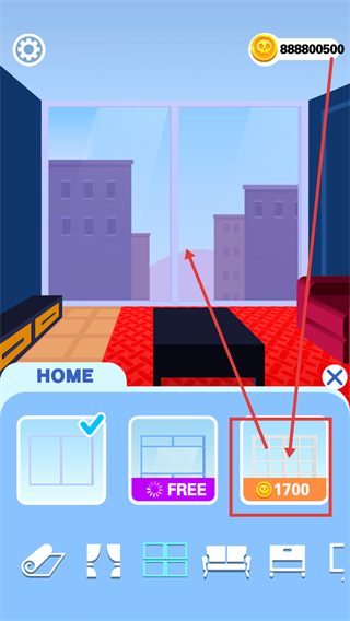 3、完成地板装饰后,消耗【1700】货币解锁网格窗户装饰,持续装饰场景可解锁更多关卡道具。