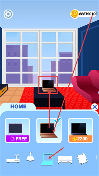 4、在【HOME】界面选择棕色笔记本电脑装饰,消耗对应货币布置场景,可解锁后续关卡内容。