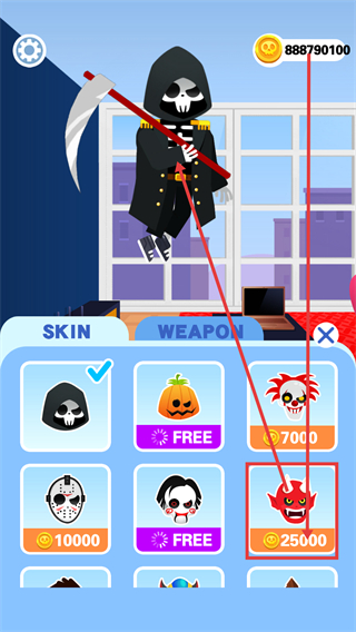 1、在【SKIN】界面中,可消耗【25000】货币解锁恶魔皮肤,也可通过【FREE】标识获取南瓜等免费皮肤装扮角色。