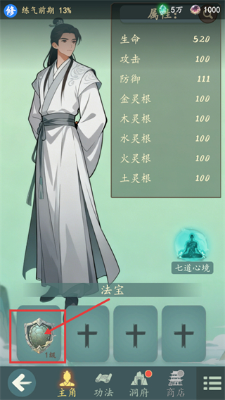 1、处于【练气前期-13%】阶段时,先装备【1级法宝】,可快速提升基础属性,助力前期战斗与修炼。