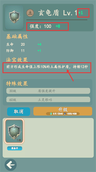 2、【玄龟盾-Lv.1+1】能提供【生命值上限10%的土属性护盾】,升级后还可增强防御,是防御型修士的核心法宝。