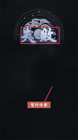 4、战斗出现【失败】提示后,点击【暂时休整】,可返回界面强化属性或法宝,提升实力后再挑战。